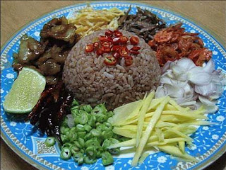 เอาน้ำมันพืชใส่กะทะ ใส่กะปิลงผัด แล้วเอาข้าวกล้องลงคลุกให้ทั่ว จัดใส่จานกินกับเครื่องปรุงทั้งหมด โดยกะปริมาณเอาตามชอบใจ